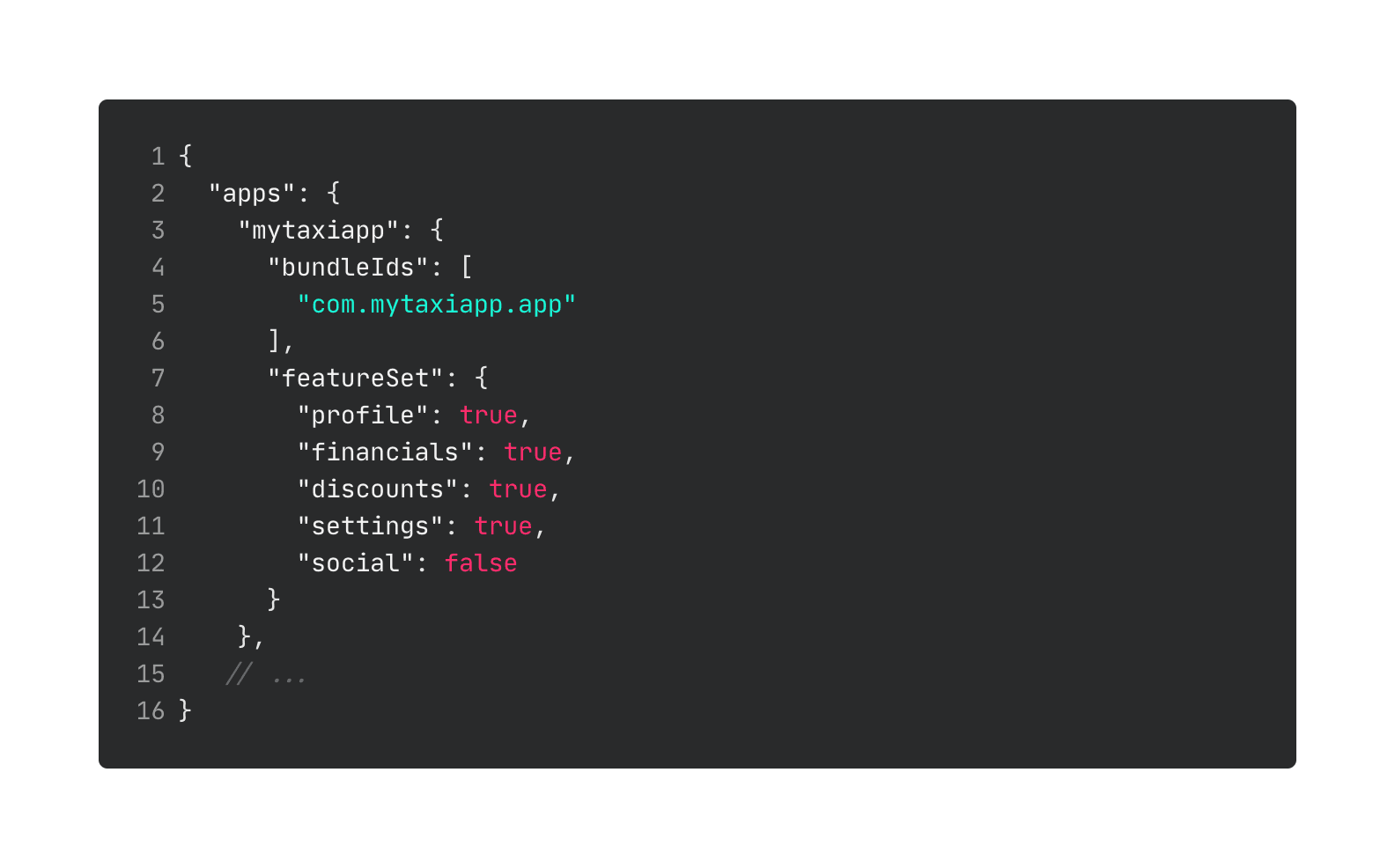 The list of apps with their feature set (a map of features that are accessible in the app) is stored in a JSON configuration file at the root of the project.