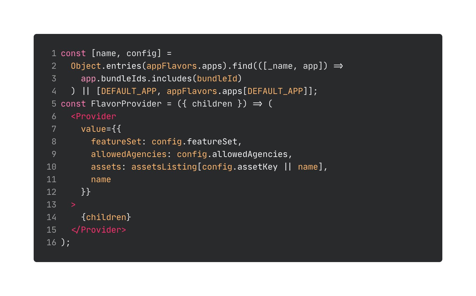 To detect the currently running app, we compare the list of bundleIds to the bundleId returned by react native device info. We then provide the current app config in a react context, with additional hooks to make this easy to use in other places of the app.