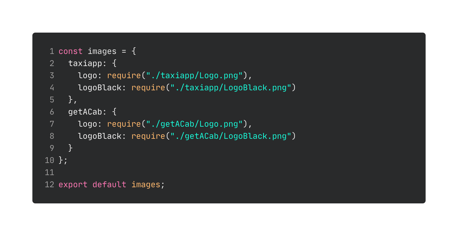 To display different logos based on the current app bundleId, we create an assetListing.js file, that imports all the assets for each branded version of the app. As we didn’t have many assets, this was the easiest solution for our usecase. If you have multiple large images, it would be better to look into dynamic imports or hosting them online.