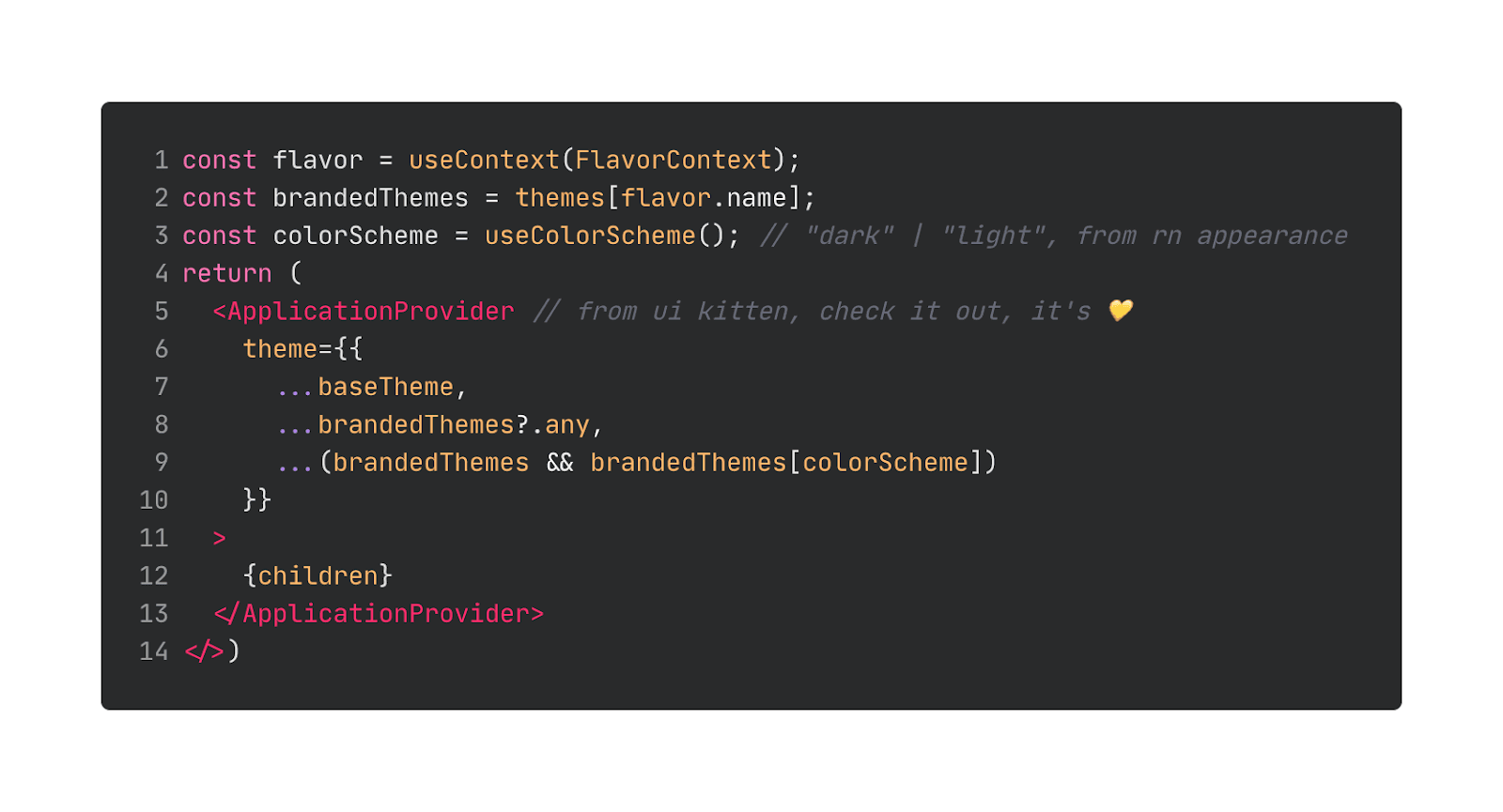 For theming we recommend using some off-the-shelf solution. In our case, we used react-native-ui-kitten that played really well with our JS config based approach. We have a general theme file and app-specific snippets that allow us to set different colors, fonts, margins or any other theme variables for each of the branded apps.