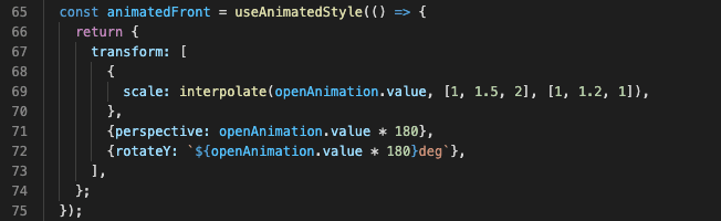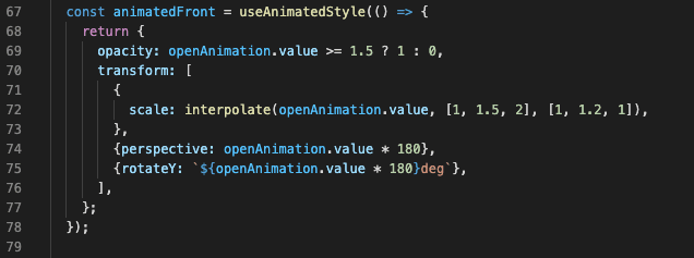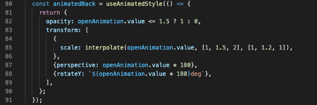 Now’s the time to use it. Let’s use the useAnimatedStyle. Inside we can see three props changed based on openAnimation shared value: scale, perspective, and rotateY.