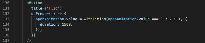 Movement shared values like x and y are controlled by gesture handler. This time we would rather flip the card by using a trigger inside the code. That’s why I added a new button that controls the openAnimation shared value. It should be animated from initial 1 to 2 and back again. This time around we can use a new function: instead of withSpring — that we are already familiar with — we can use new withTiming.