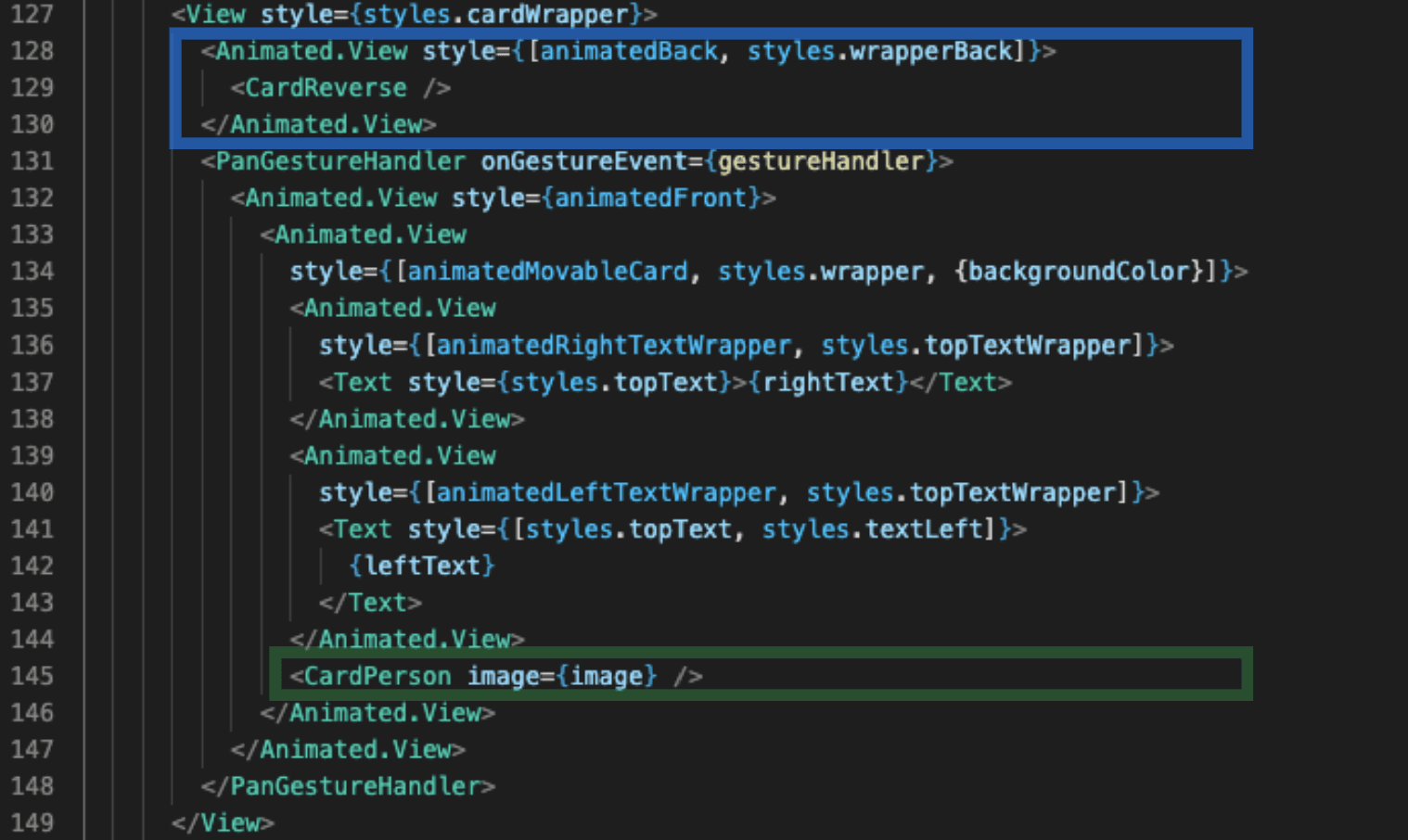 First things first, we need to update our render. To keep the single responsibility rule introduced earlier I decided to create two new Animated.View — one for each side of the card.