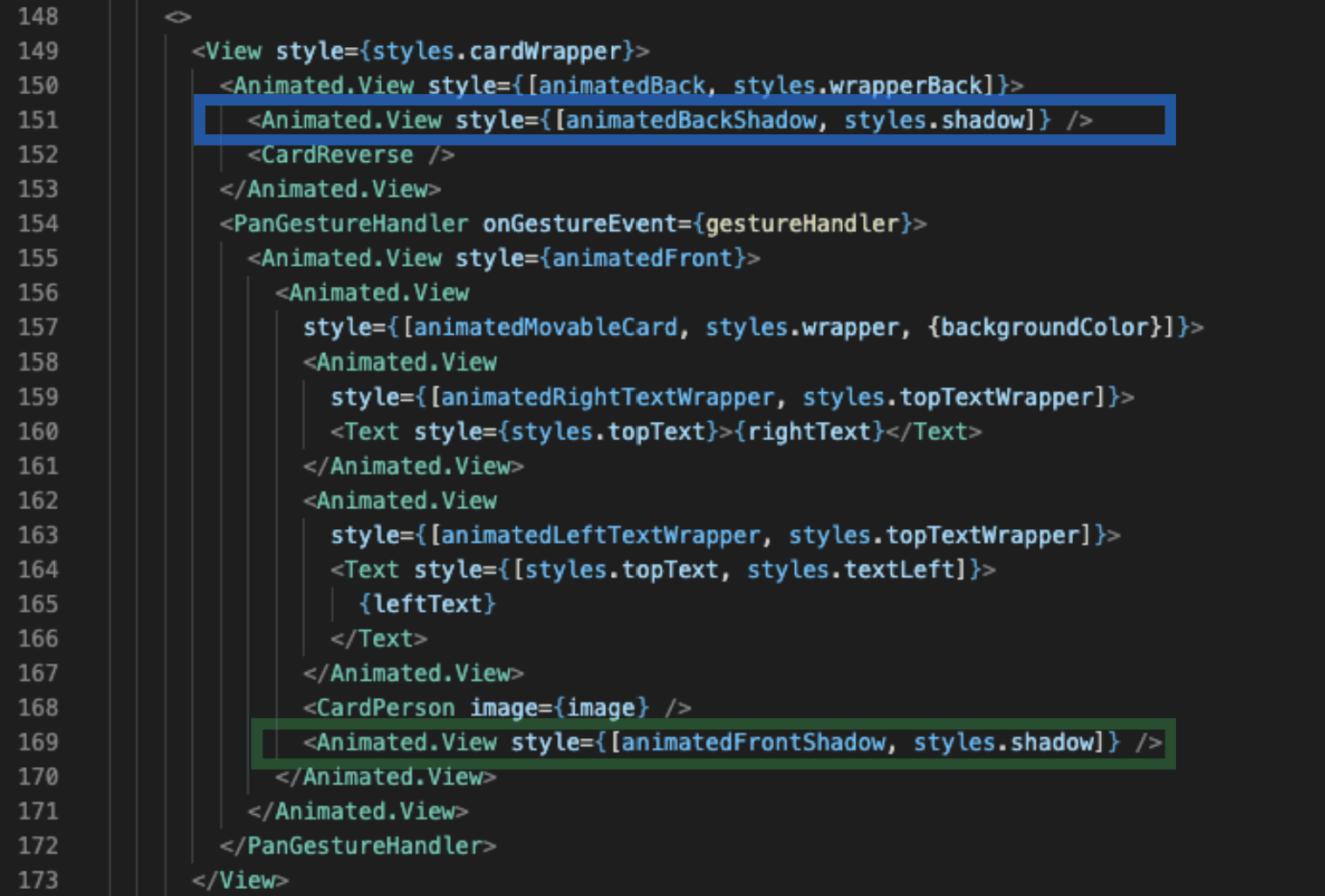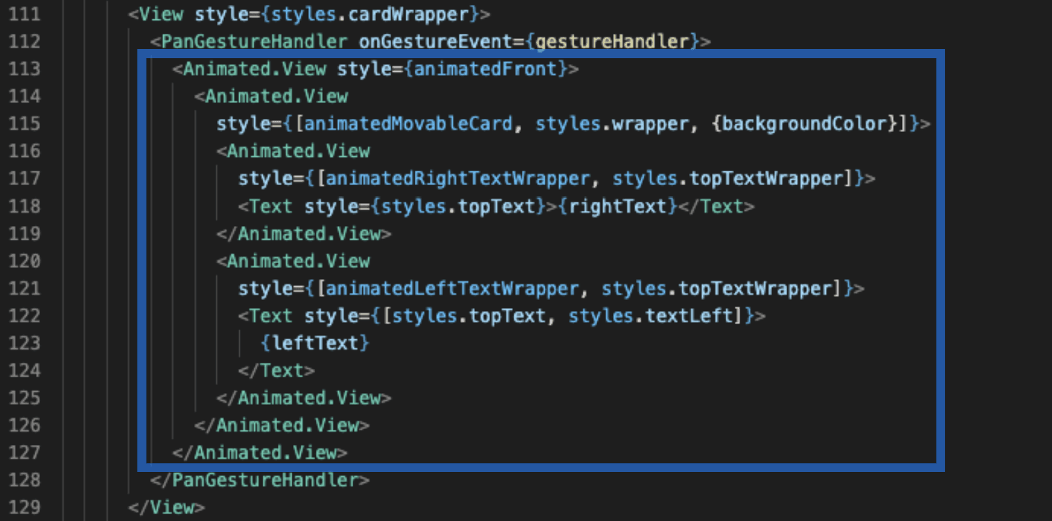 Theoretically, we could use Animated.View located directly below to get only one Animated.View responsible for both animation but since it’s used to animate finger movement I wanted to keep it as simple and as clear as possible. I did this by keeping the single responsibility for each Animated.View,so we get a separate View to turn the card around and to move it around using gestures.