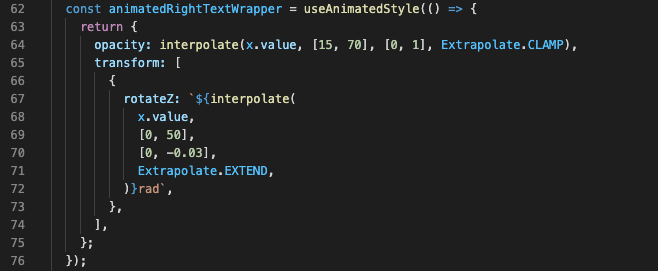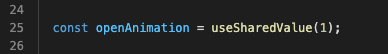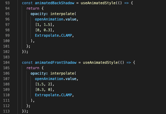 Finally, we can connect it with our openAnimation shared value. If you have a really sharp eye you can spot I used Extrapolate.CLAMP instead Extrapolate.EXTEND in the interpolation function. That’s because I didn’t want the opacity value to wander around out of control. CLAMP will keep the last given value and won’t extrapolate it further. It makes sure that the opacity will never go below 0 or above 1. If that ever happened, it would have a disastrous effect: the react-native component would be confused, and every value not in range between 0 and 1 would return just 1. That means strange visual glitches out of our control.
