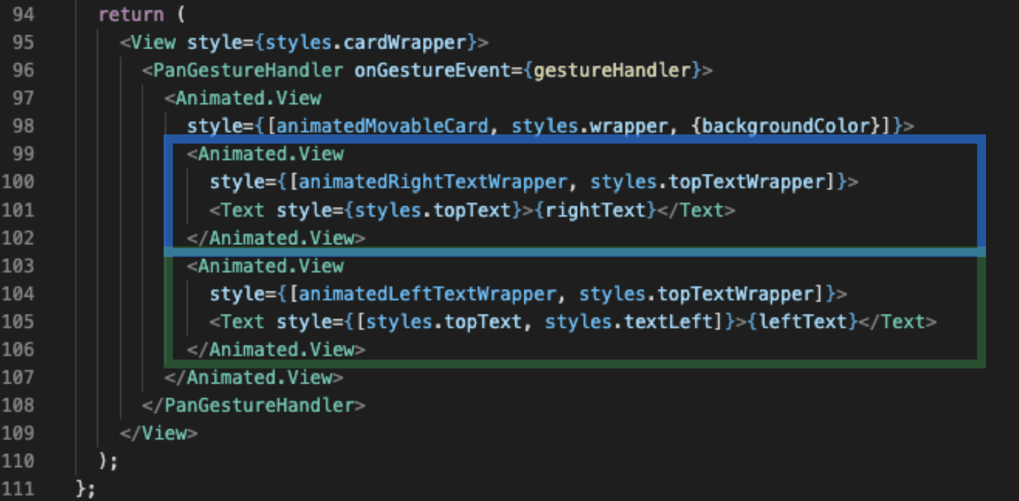 We have to remember that it’s not that simple to use shared value in code. We can’t use it simply in the code even if the component itself is Animated.View or Animated.Text. If we really wanted to make only one text wrapper we should use the useAnimatedProps hook (you can read about it here), but for simplicity in this example we always render two separate components and animate their opacity based on the card’s movement.