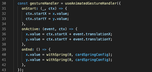 Let’s start with the first one. gestureHandler is constructed with useAnimatedGestureHandler hook imported straight from the Reanimated library. This is a new simple and amazing way to transform your input into shared values. It also can have a separate block of code for every single event like: onStart , onActive and onEnd.