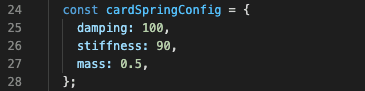 Finally, we want our card to animate smoothly to the starting position. There are a couple of ways to animate some value to a given value. First, I’m going to introduce you to the mechanism that can smoothly animate any variable to a given value using physics: withSpring. Additionally, to make things spicier we can create our own config we want to use in a given spring animation. Pretty!