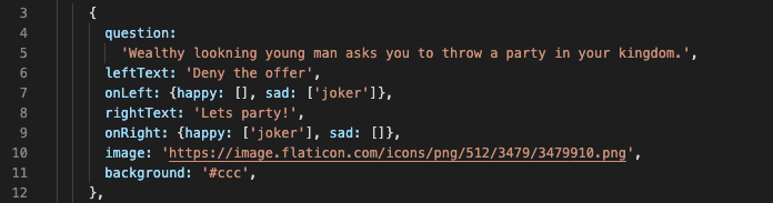 question, leftText and rightText are just strings to be shown during each turn. onLeft and onRight are used in answer handlers: they inform us what are the consequences for each answer. Three possible personas to amuse are Woman, Knight, and Joker. Last things are image and background that determine the final looks of the card.