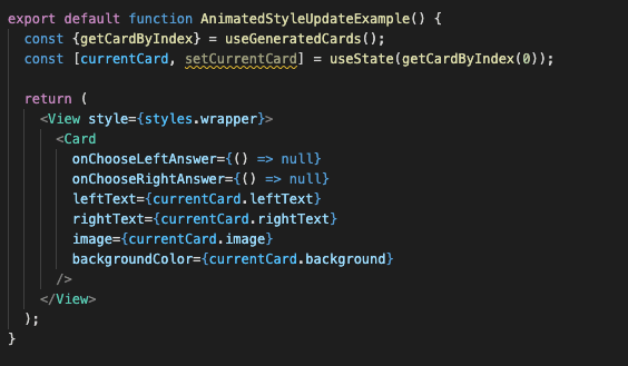 Now, let’s look at the second element I previously mentioned -animatedMovableCard. We can see that it contains a useAnimatedStyle hook. Inside it, we can create any function that can use shared values and return some style object. In our case, we just use x as translateX and y as translateY . That would be enough to make our card move, but to make it prettier we can add some rotationZ such that it rotates a little as it goes away from the center.