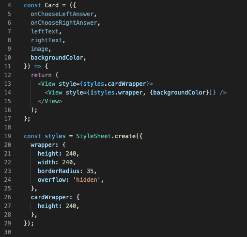 Next, we have Screen.js. This is the main screen of the application. We will hold all necessary components there. For now, we can see that it returns a simple wrapper with a single Card in it.