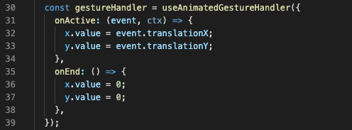 The simplest version of handler for our example would contain only onActive updating x and y based on the position of the finger, and reset the position when the finger is released using onEnd handler.