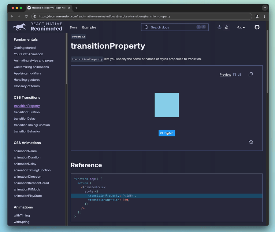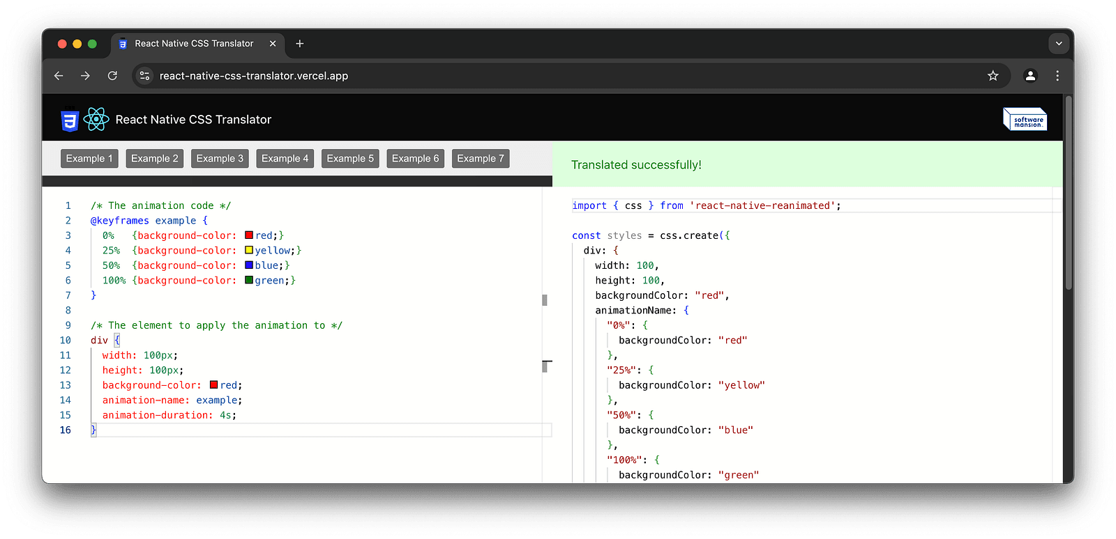 If you have an existing CSS code or want to try out some demos written in CSS, you can also check out our new online translator tool that converts CSS code into the JavaScript syntax that Reanimated understands: