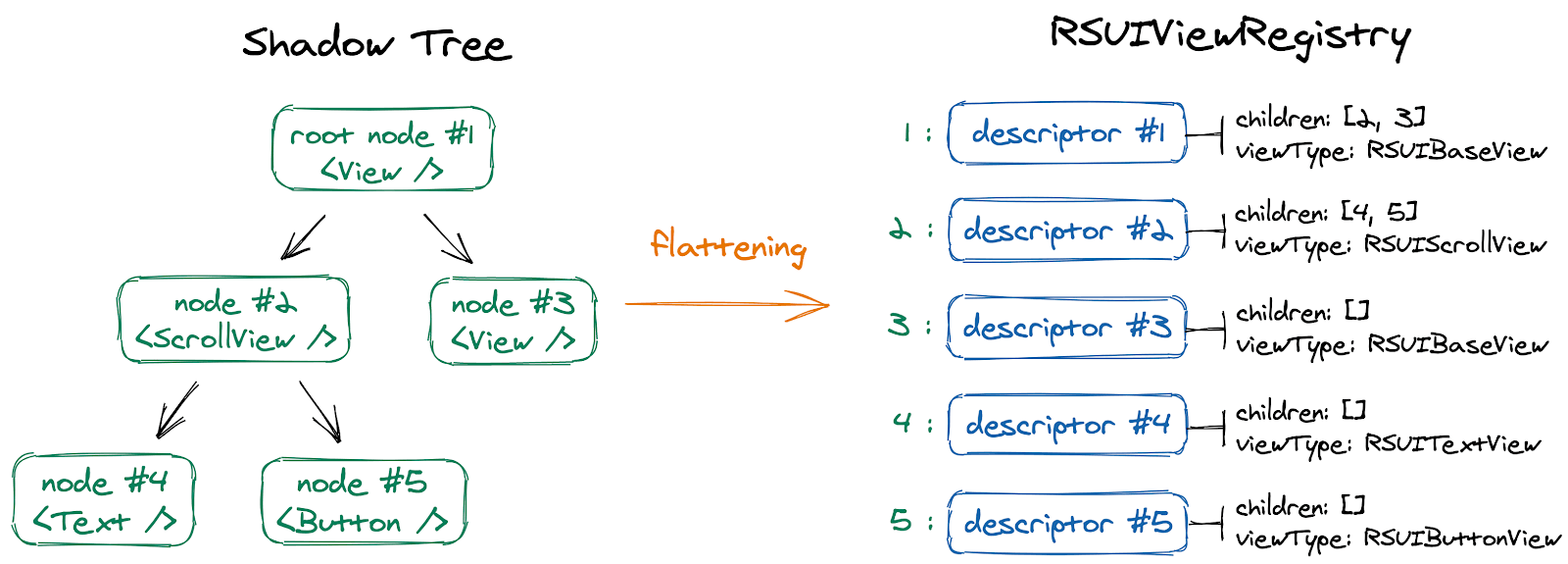 In RCTFabric all mutations on the view tree are handled by MountingManager which is responsible for creating, removing and updating UIKit views — in other words it manages the shadow and UIKit view trees and keeps them in sync. In SwiftUI however we don’t really interact directly with the native view tree in a sense that we don’t have access to mutable tree nodes — that’s what SwiftUI rendering engine takes care of. As a result, the responsibility of instantiating, removing and updating views can be shifted to SwiftUI. Instead of maintaining the native view hierarchy on our own, we can temporarily flatten it and only keep a registry of views instantiated by React and their corresponding attributes (including their children).